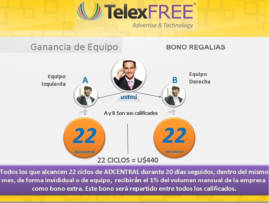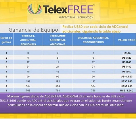 1. AD CENTRAL: tiene un costo de: $50 + $289 = $339 dólares por contrato de 1 año, es decir usted solo pagara esa cantidad 1 ves en el año, sin pagos mensuales, sin pagos semestrales, y sin tener que hacer un auto envió. Tu trabajo será poner 1 anuncio de TelexFREE todos los días de lunes a domingo y ganarás: 20 dólares por semana, 80 dólares al mes.