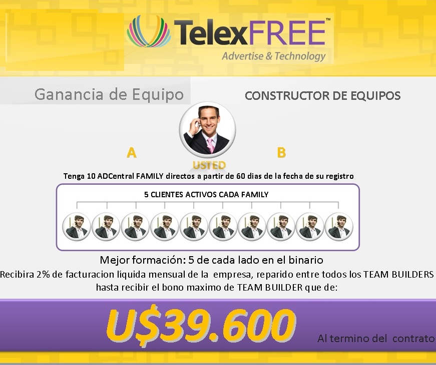 2. AD CENTRAL FAMILY: tiene un costo de: $50 + $1375 = $1425 dólares por contrato de 1 año, es decir solo pagarás esa cantidad 1 ves en el año, sin pagos mensuales, sin pagos semestrales, y sin tener que hacer un auto envió. Tu trabajo será poner 5 anuncios deTelexFREE todos los días de lunes a domingo y ganarás: 100 dólares por semana, 400 dólares al mes.